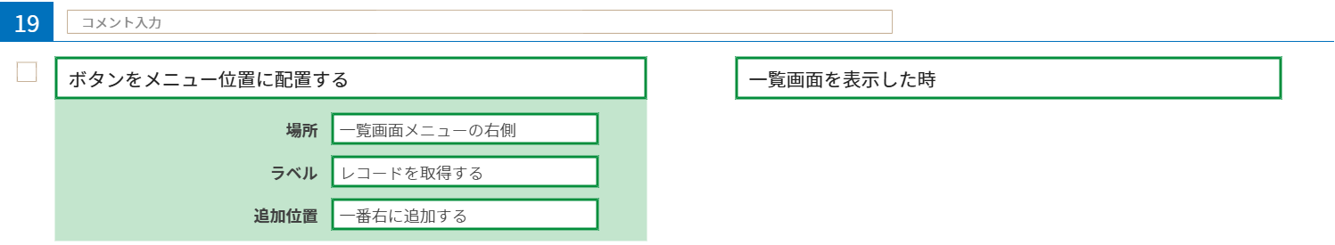やること「ボタンをスペースに配置する」、条件「一覧画面を表示した時」を使い、一覧画面表示時にボタンを配置するようにします。