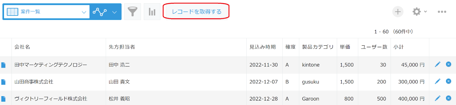 上記の場合、一覧画面の絞り込み条件で「確度 A もしくは B を含む」「見込み時期が今年」という設定がされているため、この条件に該当するレコードがすべて取得されることとなります。