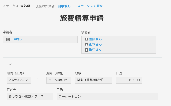 このような申請アプリがあって、次のステータスに進める時に「承認者」フィールドのユーザーを「作業者」として指定しているアプリがあります。