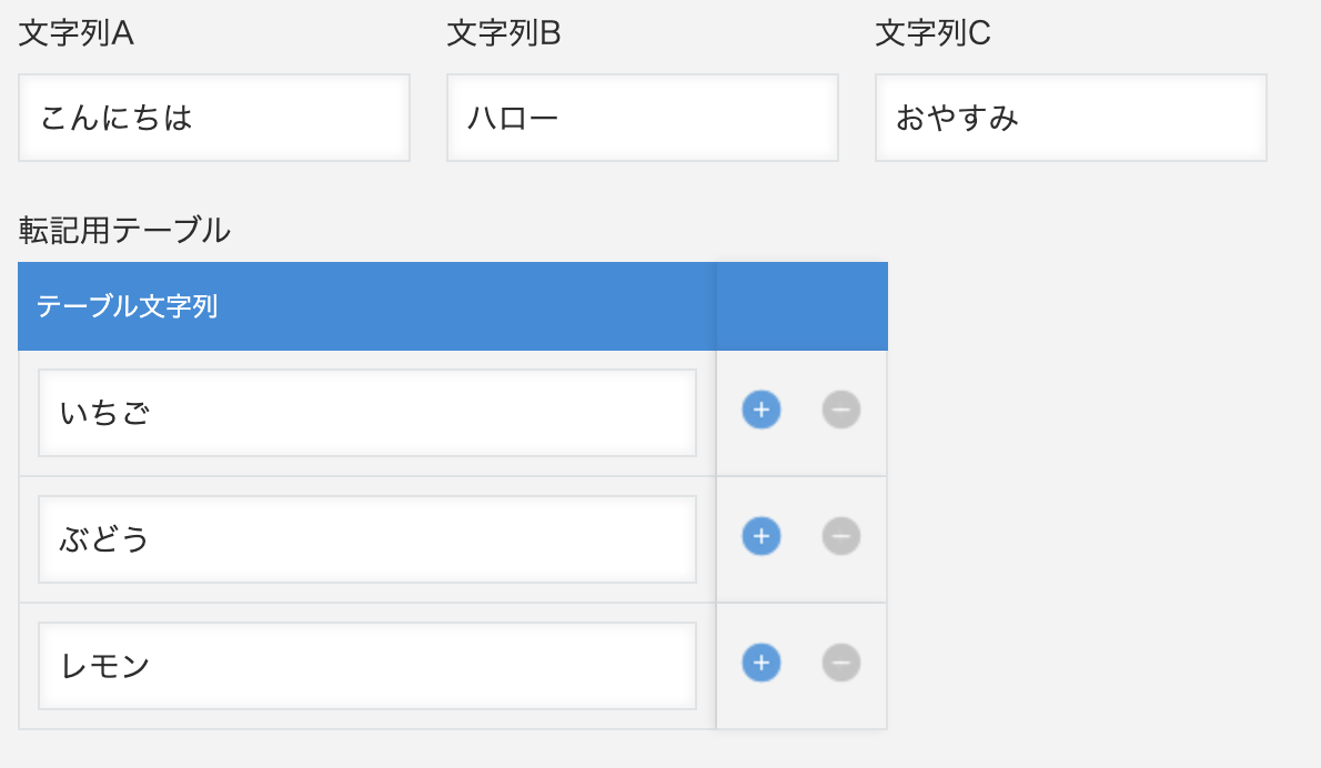 {"文字列A":"こんにちは","文字列B":"ハロー","文字列C":"おやすみ","配列X":[{"文字列X":"いちご"},{"文字列X":"ぶどう"},{"文字列X":"レモン"}]}