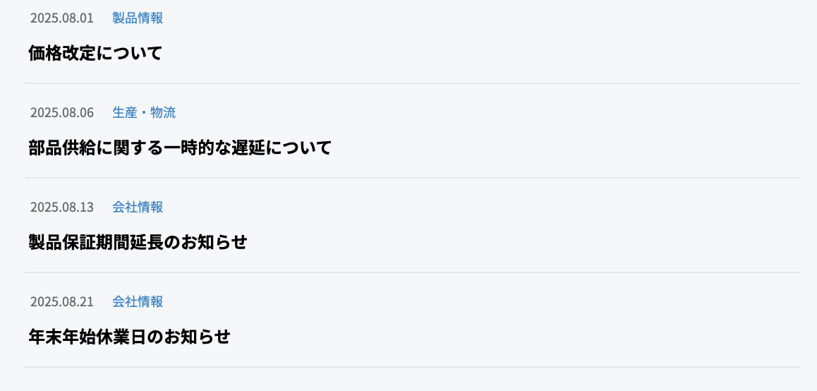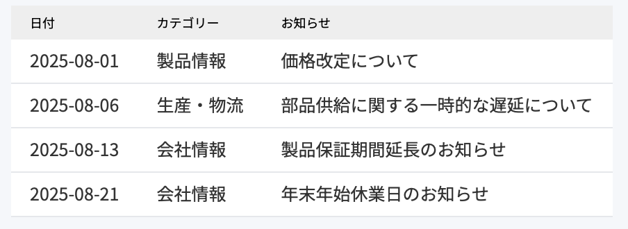 - お知らせカテゴリーが「会社情報」「生産・物流」「製品情報」のいずれか