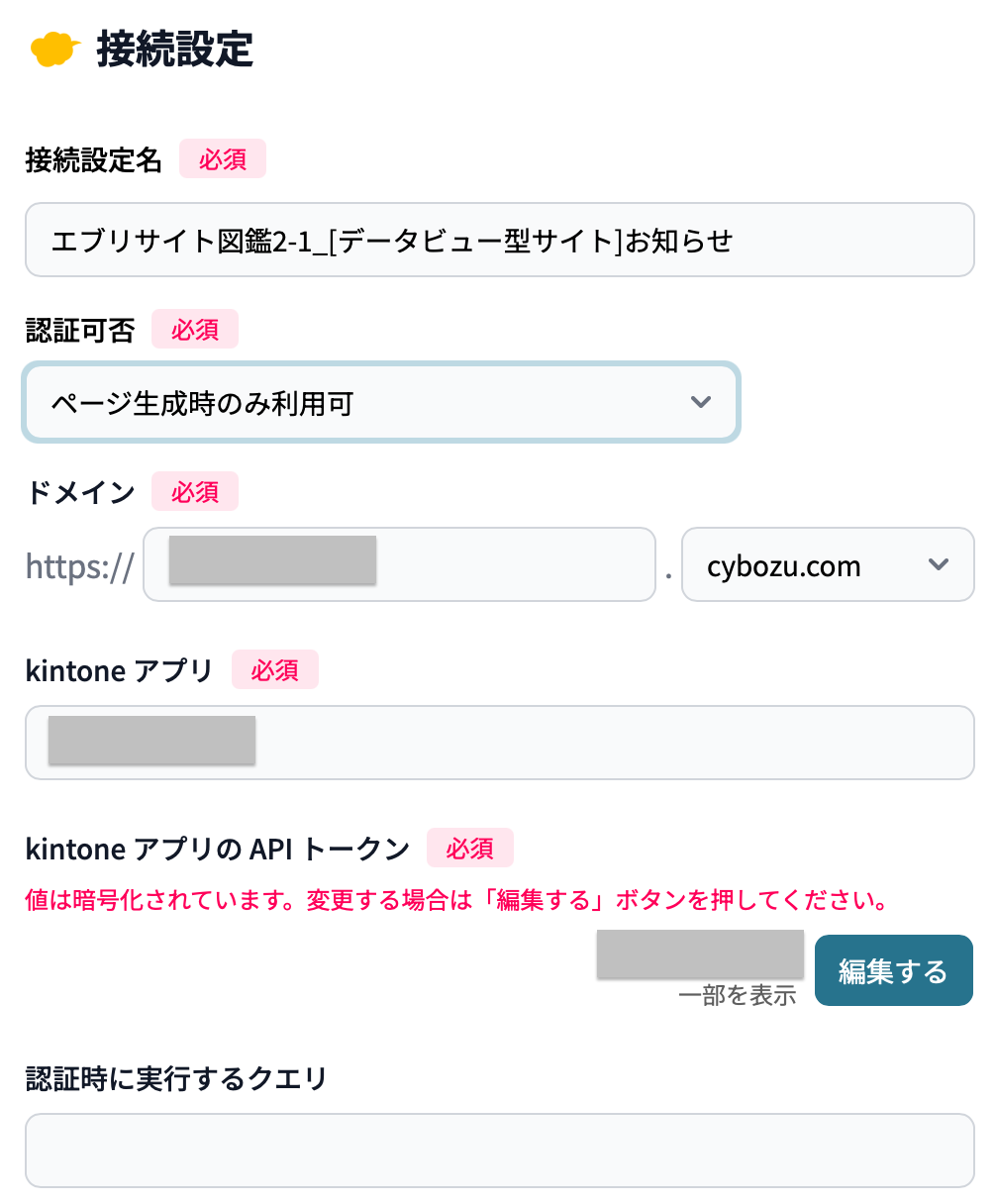 接続先は「kintone」を選択し、誰でも見ることができるサイトとしたいので「ページ生成時のみ利用可」としています。