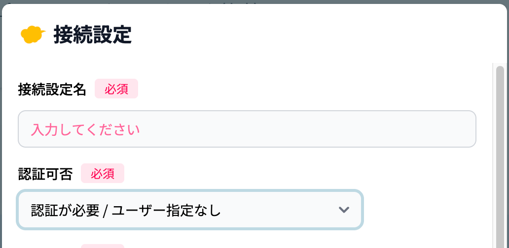 そのため「認証可否」に「認証が必要 / ユーザー指定なし」を設定して接続設定を行います。