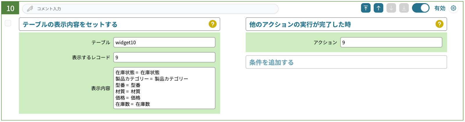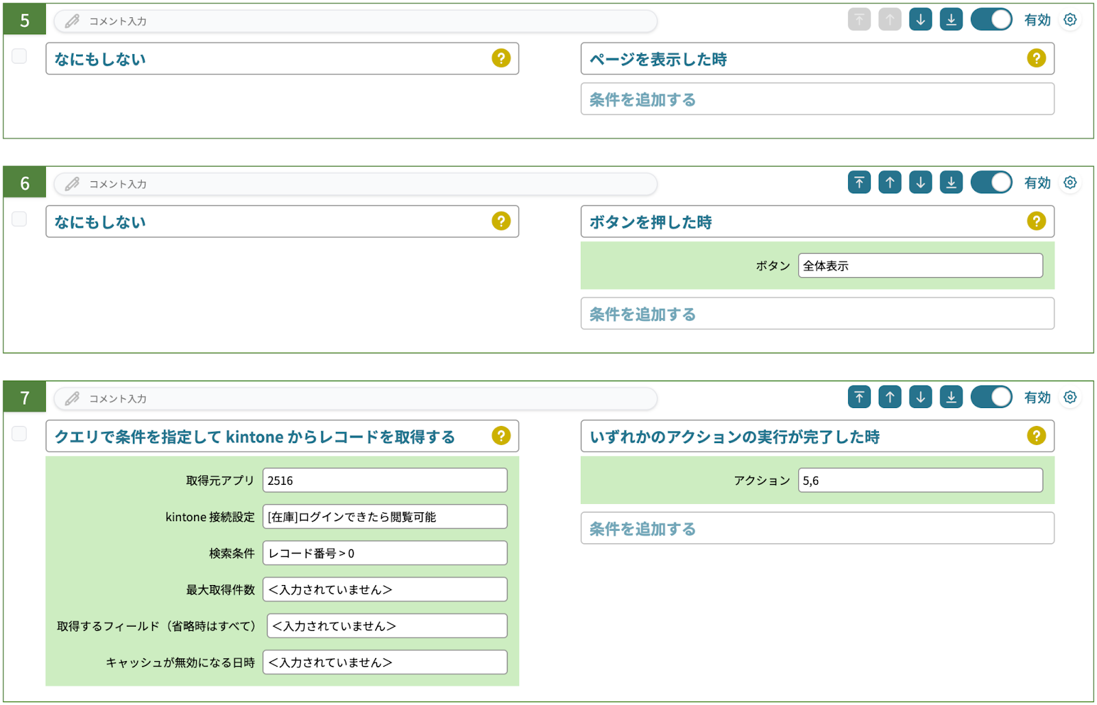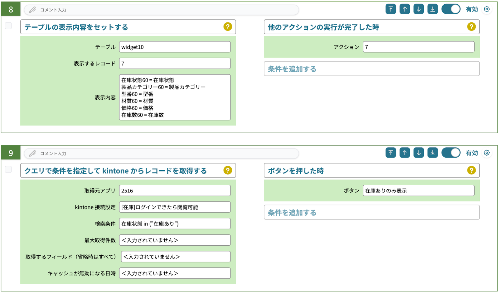 やること「クエリで条件を指定して kintone からレコードを取得する」を、条件「ボタンを押した時」にレコードを取得します。