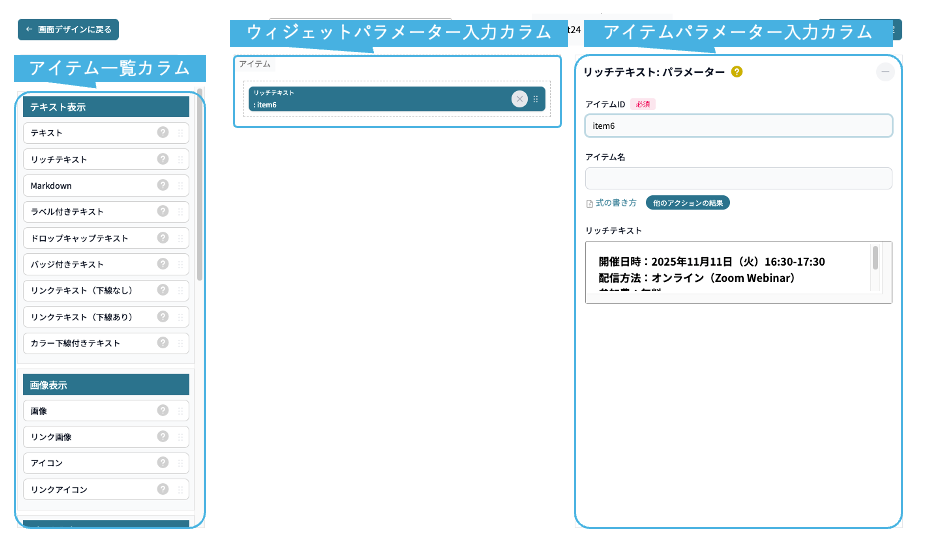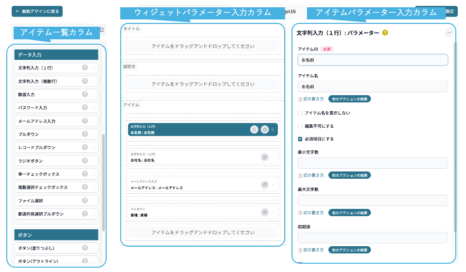 「アイテム一覧カラム」からフォームに必要な「アイテム」をドラッグアンドドロップで「ウィジェットパラメーター入力カラム」に追加します。追加した「アイテム」を選択すると、右側に「アイテムパラメーター入力カラム」が表示されるので、「アイテム」の詳細を設定します。
