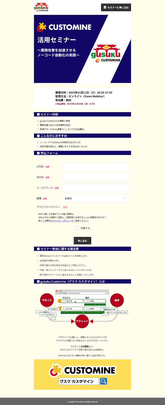 この記事では、セミナーのランディングページの作成と、フォームで入力した申込内容をkintoneに保存するための設定例を紹介します。
