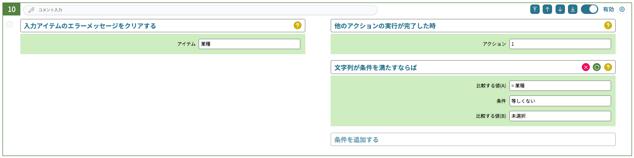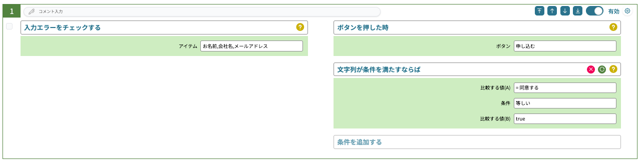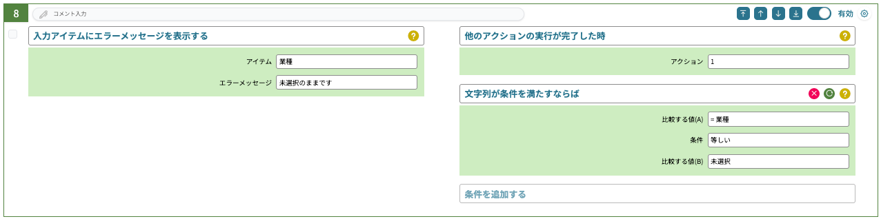 追加条件「入力アイテムにエラーがあるならば」を反転させた「入力アイテムにエラーがないならば」を設定します。