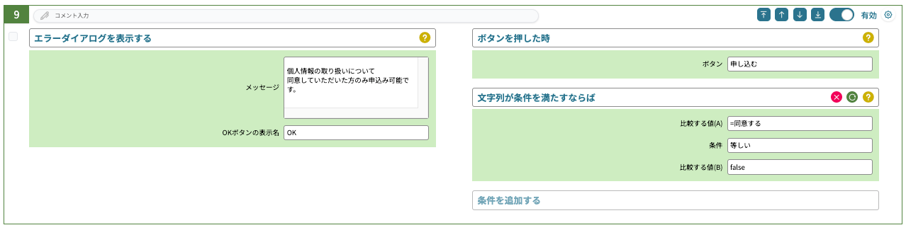 アイテム「単一チェックボックス」では必須設定を行えないので、ページ内処理のやること「エラーダイアログを表示する」でエラーを表示し、条件「文字列が条件を満たすならば」でチェックが入っていない時とします。