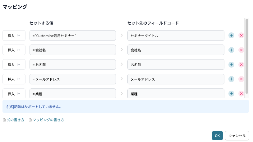 マッピングの「セットする値」にはアイテムパラメーターで設定した「アイテムID」を、「セット先のフィールドコード」にはkintoneアプリで設定した「フィールドコード」を記述します。
