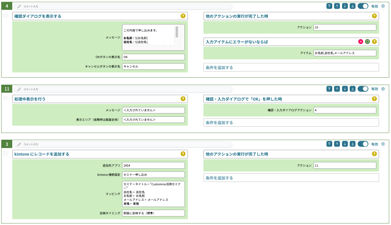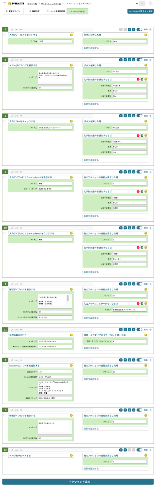 最後にやること「情報ダイアログを表示する」でメッセージを表示し、やること「ページをリロードする」でページのリロードを行い入力内容をクリアします。