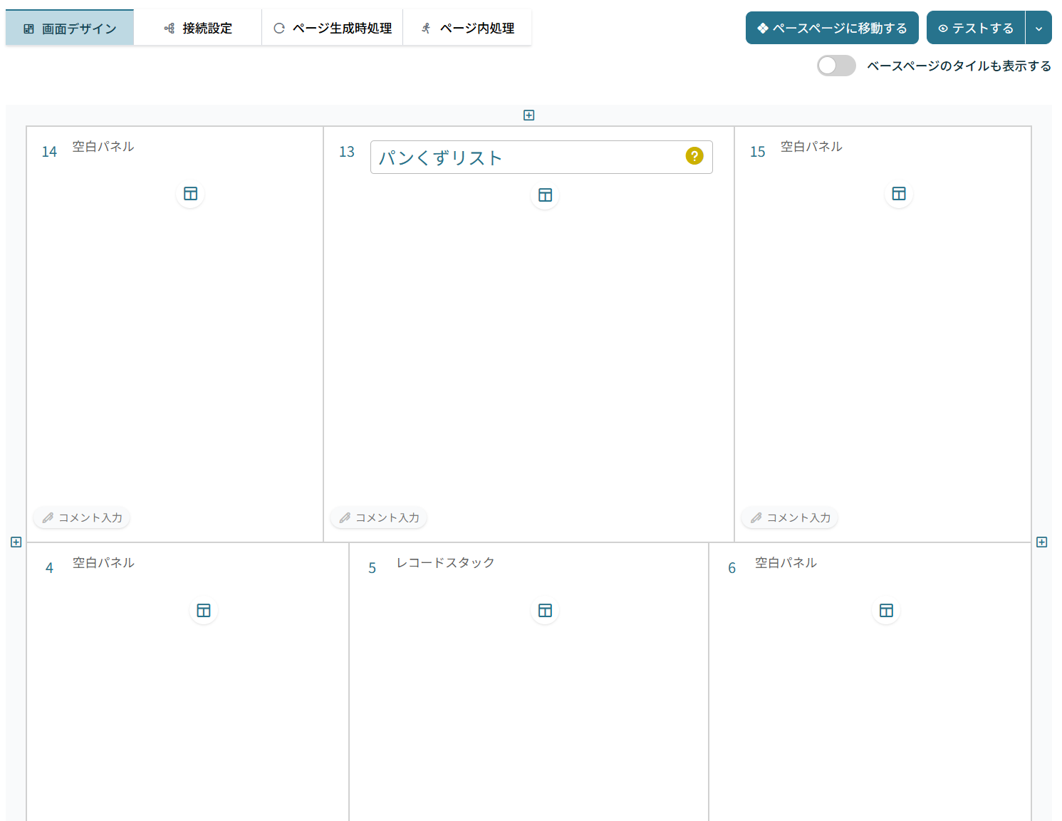 「空白パネル」はタイルの両端に余白を作成するために配置しているため、このページで主要なタイルは13のウィジェット「パンくずリスト」と5のウィジェット「レコードスタック」です。