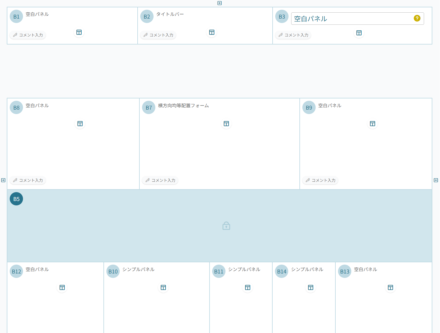 水色で囲んだ「B5」がベースページを使用した各ページで編集可能なタイルで、それ以外の赤色で囲んだタイルが共通で表示したい部分なので、赤色の部分をベースページで設定します。