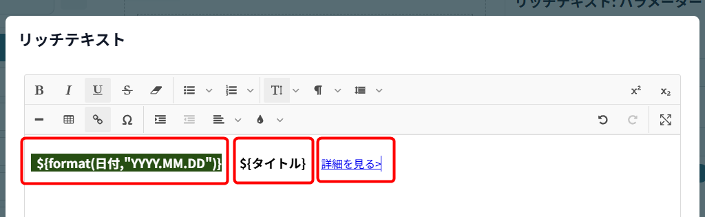 リッチテキストの文字色が白(#FFFFFF)なので見えませんが、下記のように日付フィールドとタイトルフィールドの値を表示するように設定しています。