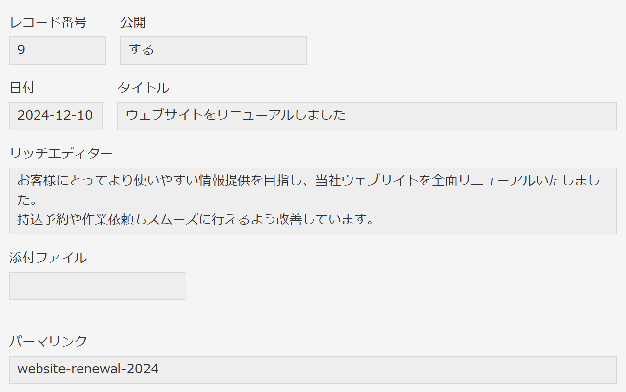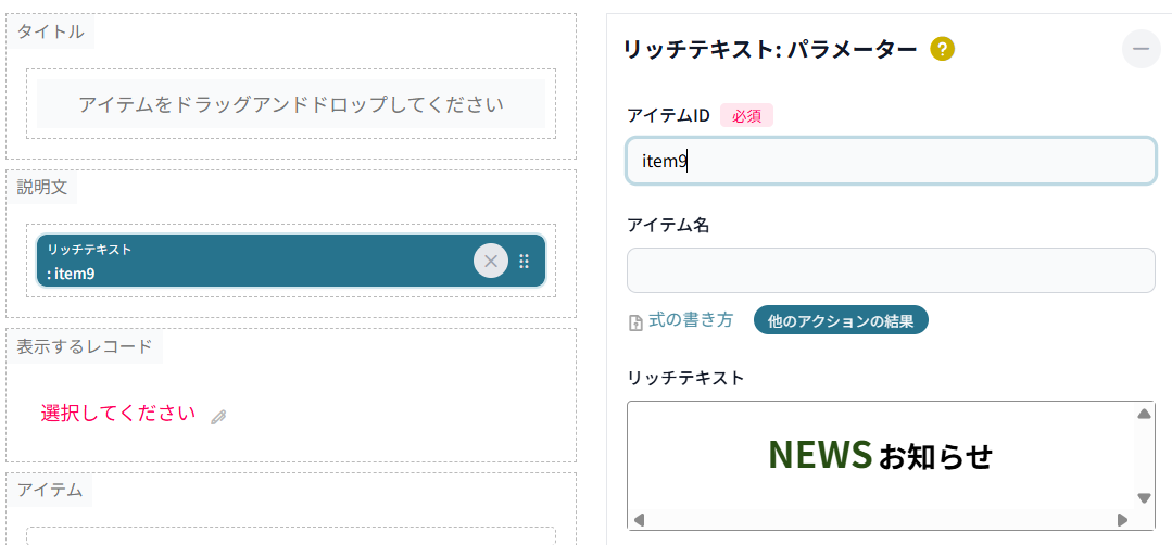 「説明文」で「NEWS お知らせ」を表示し、「アイテム」でレコードの内容を表示します。