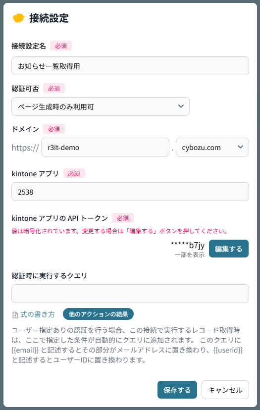 認証は不要なページですので「認証可否」は「ページ生成時のみ利用可」、ドメインや kintone アプリのアプリIDなど必要な情報を指定します。