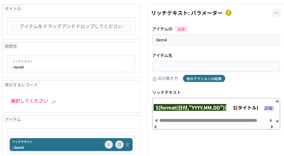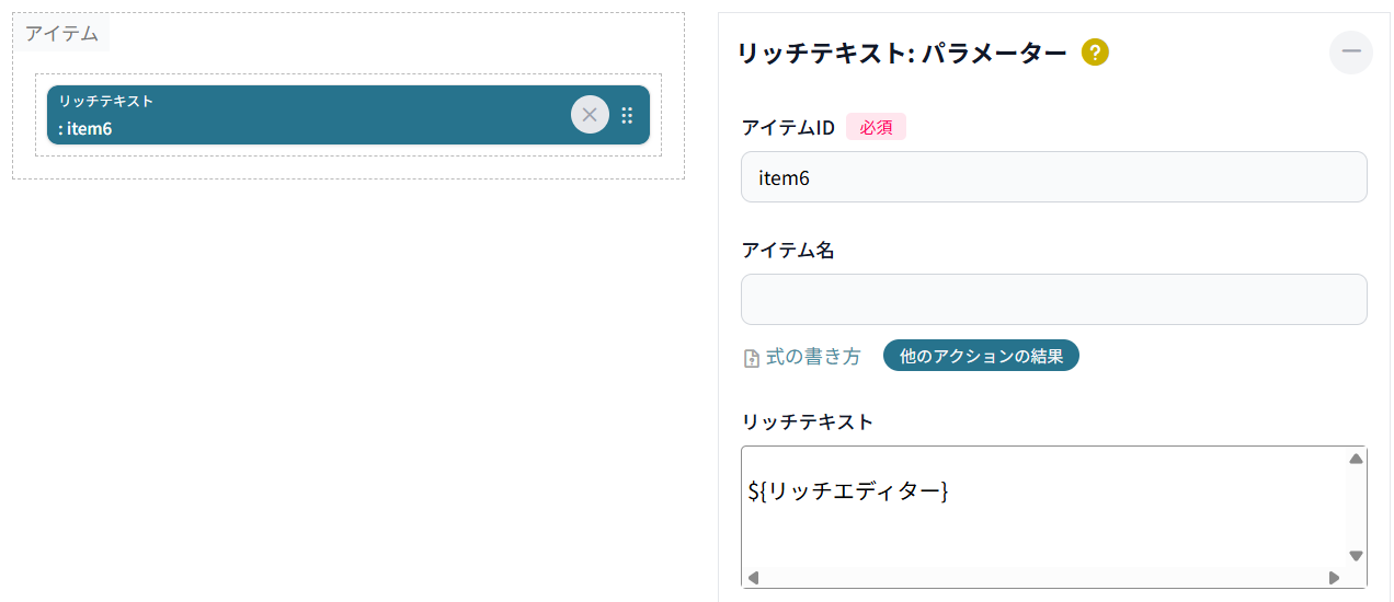 アイテムの設定は下記の通りです。リッチテキストのアイテムの設定が続きます。