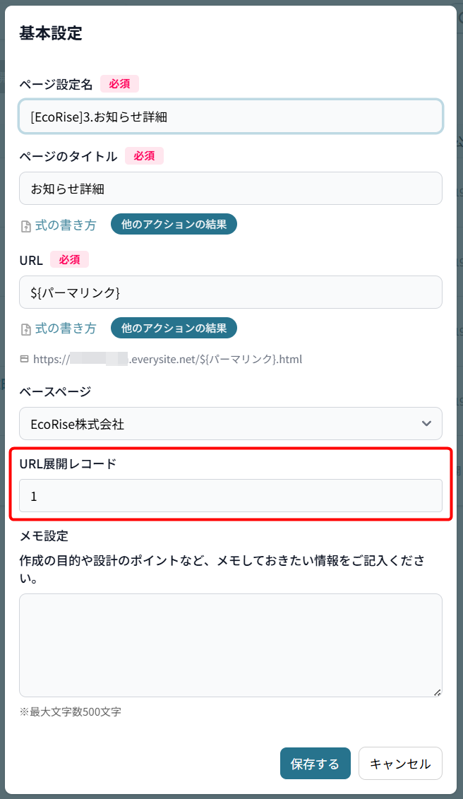 ページの新規作成の時にはなかった「URL展開レコード」が追加されているため、上記で設定したアクション1を指定します。