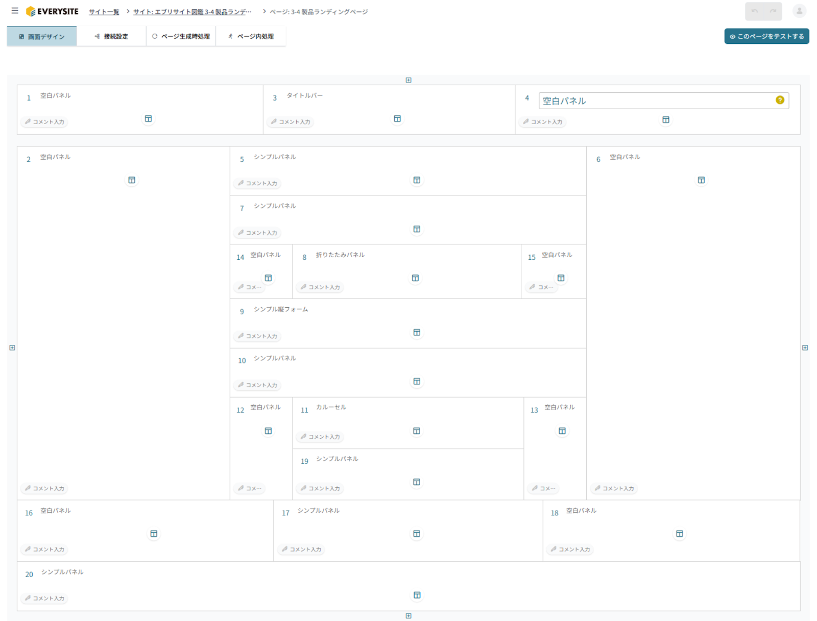 ページの全体像(レイアウト)を決める部分になりますので、いったん、紙の上や他のツール等でページのデザインを検討した上で、エブリサイトの画面デザインの設定に進んでいただくとスムーズです。