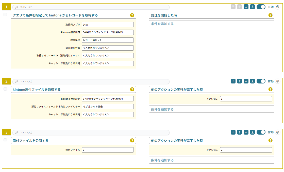アクション1番で、公開する1レコードを取得後、やること「kintone添付ファイルを取得する」でレコードに添付されているファイルを、kintone から取得しエブリサイトで使用する準備を行います。