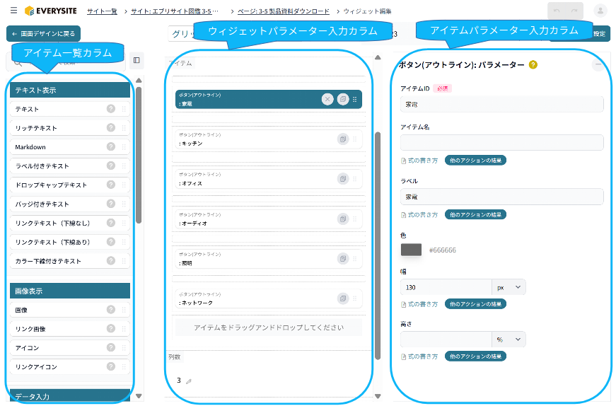 今回は、製品カテゴリを選択するためのボタンを「ボタン(アウトライン)」で作成し、列数を「3」としています。