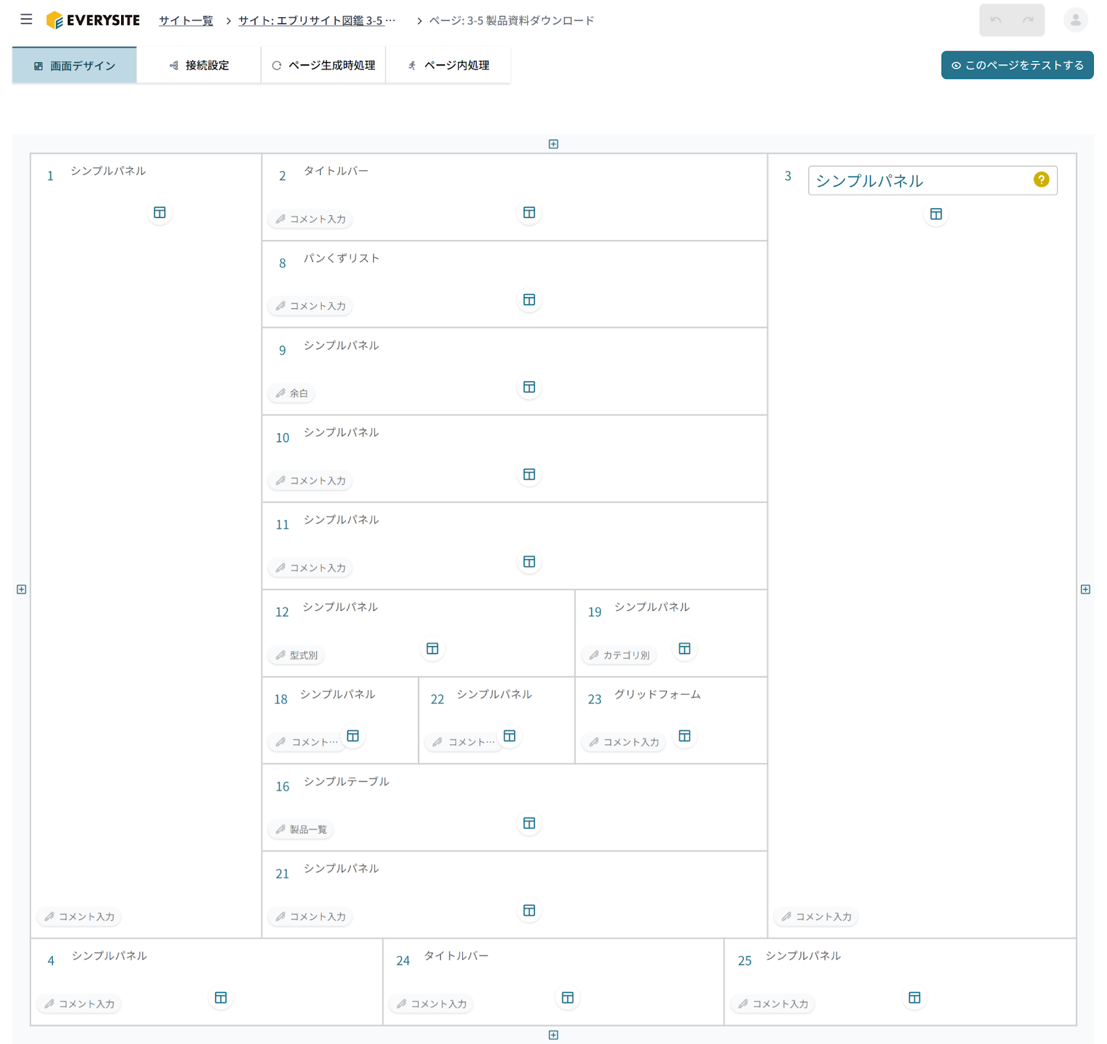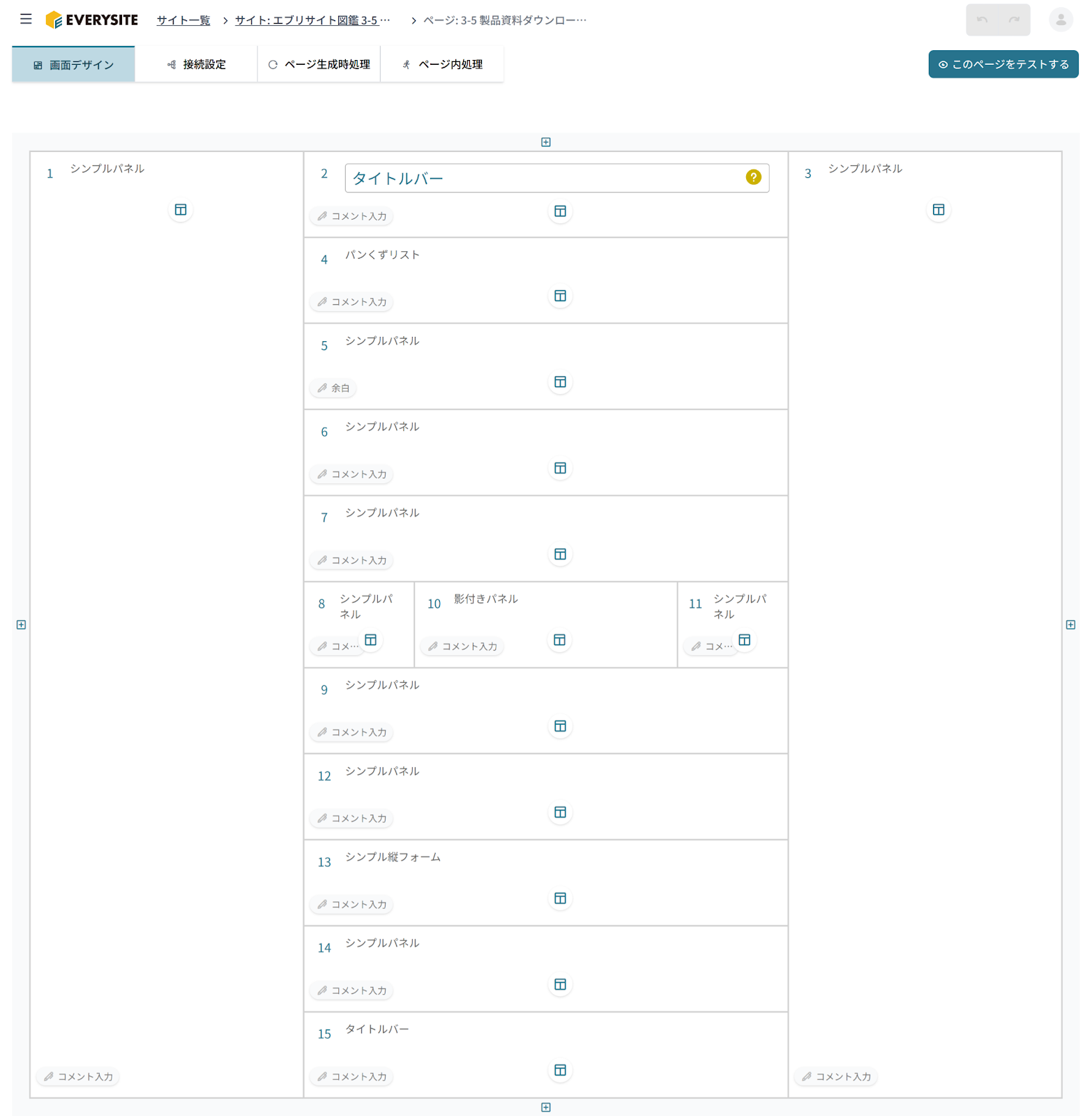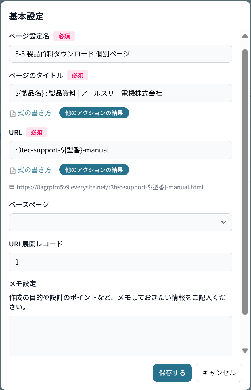 「製品資料ダウンロード」ページについて、下記の通りページの基本設定をします。