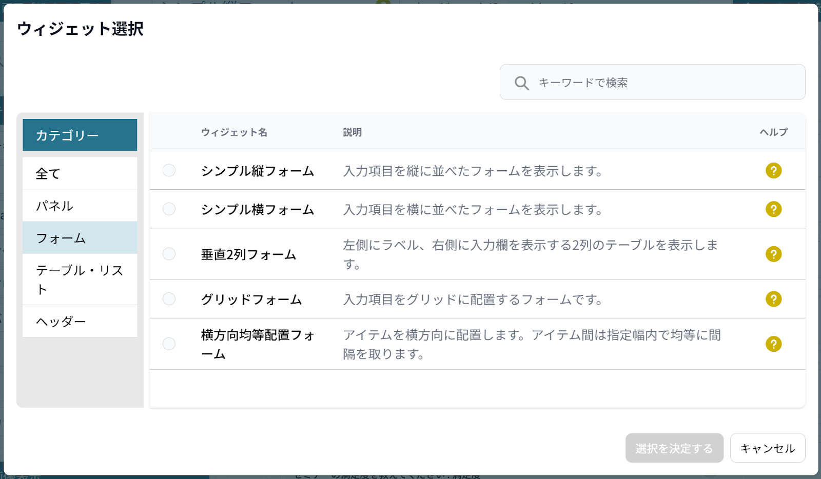 フォームカテゴリにあるウィジェットは、データ入力に適したレイアウトを作成できます。入力されたデータを kintone のレコードとして追加・更新する、などができます。