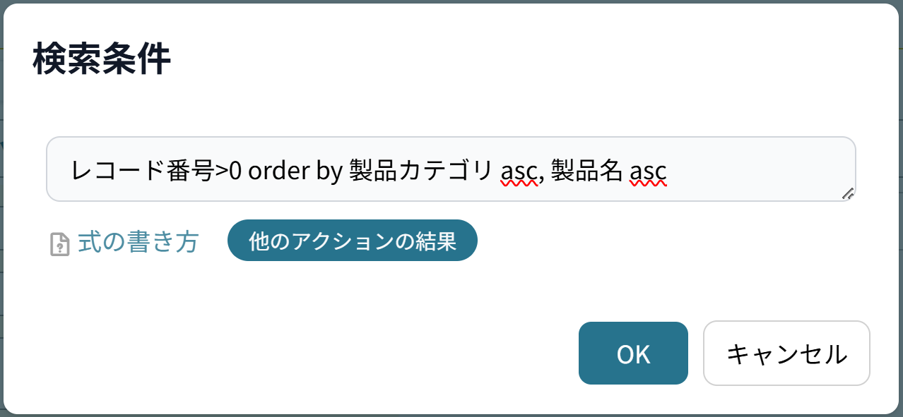 製品カテゴリ に合致したレコードを、製品名昇順で取得するための検索条件を指定しています。