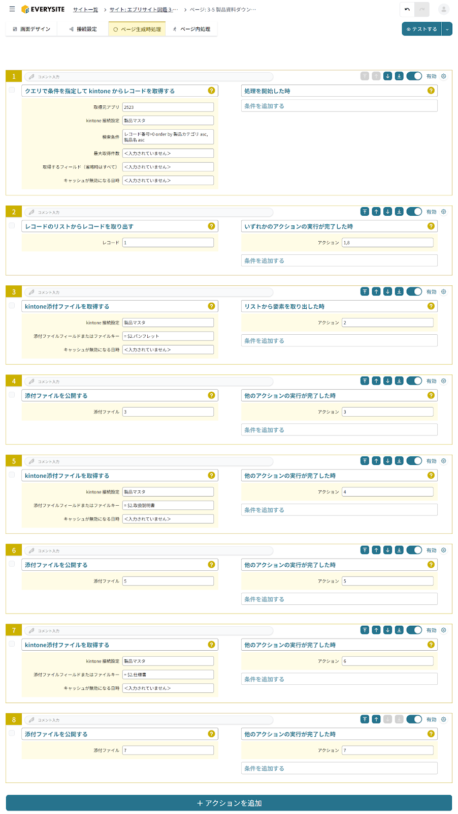 ページ生成時処理により、公開時に予め kintone の製品マスタアプリにあるレコードから、各製品の資料ダウンロードページを作成しておくイメージになります。