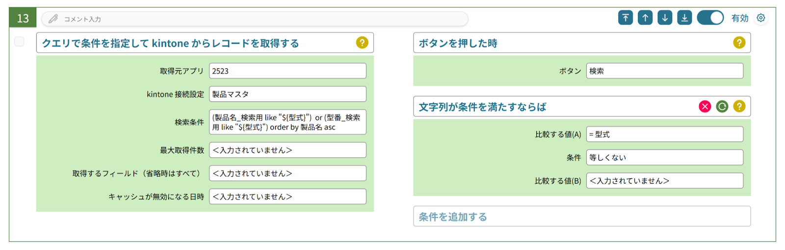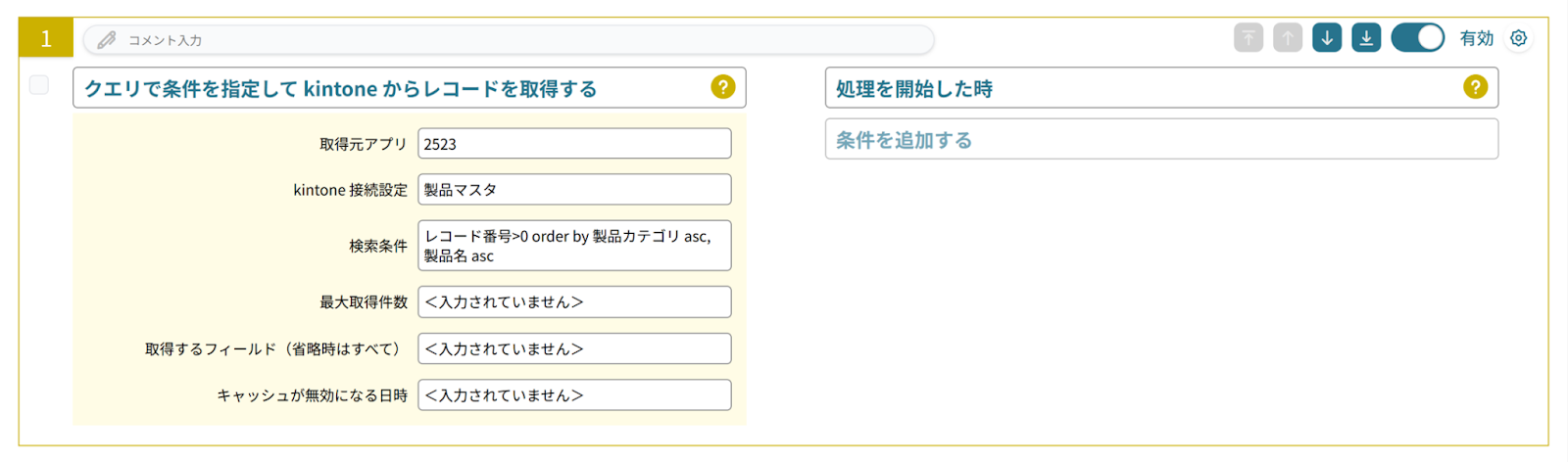 まず、「接続設定」で設定した kintone の製品マスタアプリから、やること「クエリで条件を指定して kintone からレコードを取得する」でレコードを取得します。