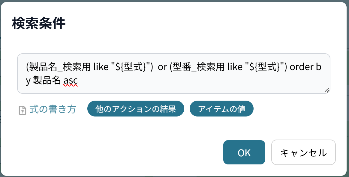 ここでのクエリは、アイテム「文字列入力(1行)」で設定した アイテムID:型式 に入力された値から、レコードを取得しています。