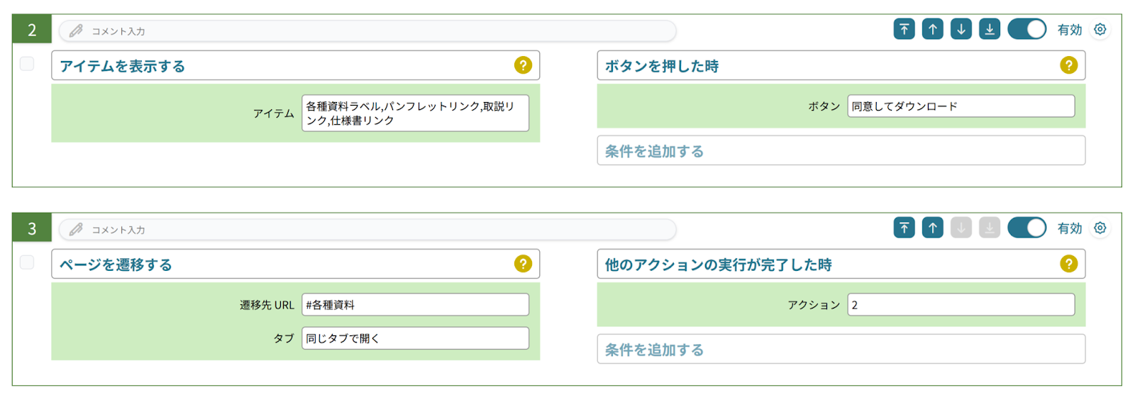 次に、「同意して製品資料をダウンロードする」のボタンを押した時に、上で非表示にしたアイテムを表示します。