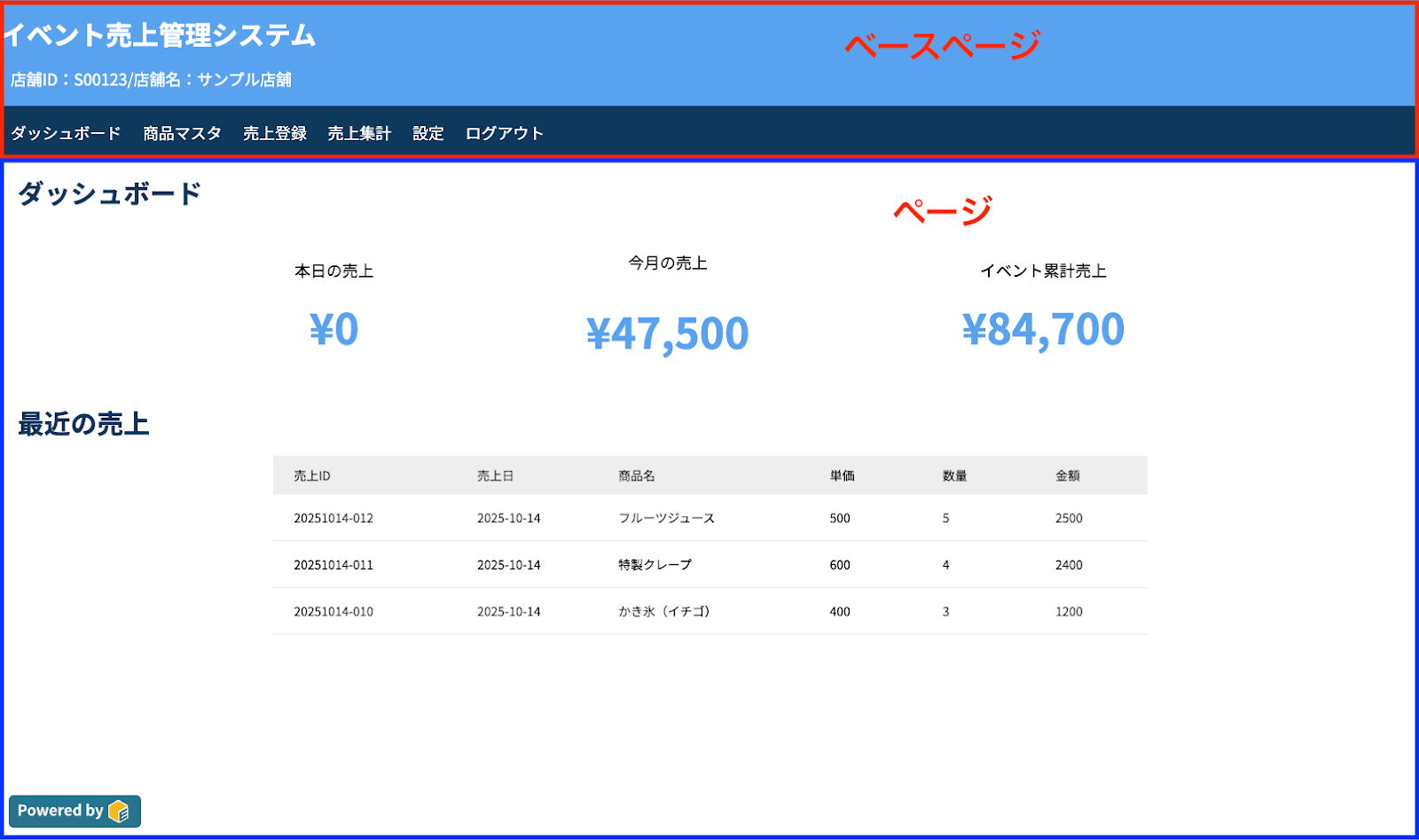 今回はベースページを使うので、画面はベースページとページで構成するデザインになります。