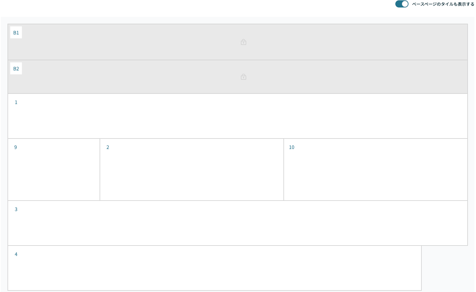 なお、「ベースページのタイルも表示する」をONにすると両方のタイルを表示することも可能なので、全体を確認しやすくなります。ただ、全体のレイアウトを表示するだけなので、その画面から設定に進むことはできません。