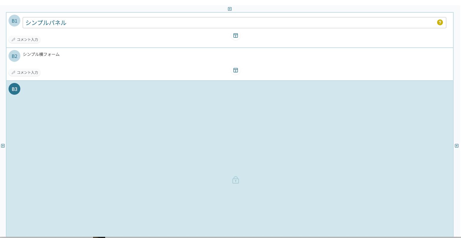 B2のタイルではいわゆるグローバルナビゲーションとして、各ページにリンクしたメニューを作るために、「シンプル横フォーム」に「リンクテキスト(下線なし)」を横並びにしています。「リンクテキスト(下線なし)」はリンク先URLを設定するとそのURLへ遷移します。