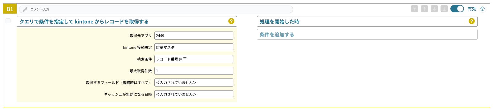 今回はアプリに保存されているレコードがテスト用の1レコードだけなので全レコード取得のクエリを指定しています。