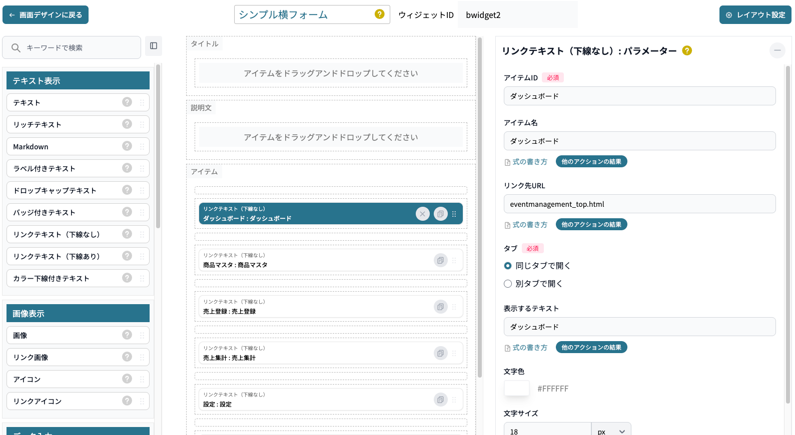 今回の設定は使うシーンが多いと思います。「シンプル横フォーム」に「リンクテキスト(下線なし)」を追加するだけで、メニューをいくつも追加できますし、「シンプル横フォーム」を追加すれば2段にすることも可能です。