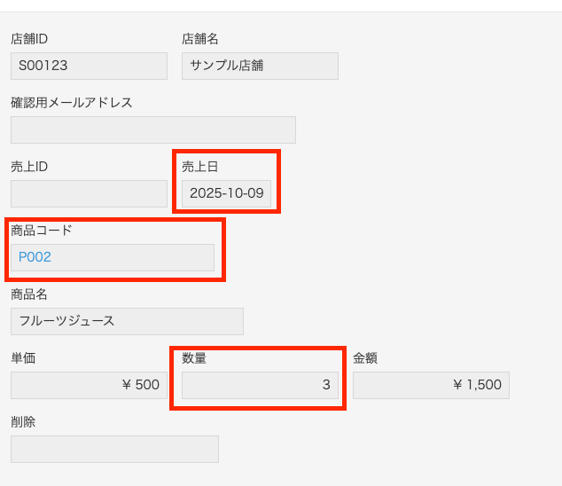 「売上を登録」のボタンを押すと、登録先アプリの赤枠の3フィールドに値をセットします。