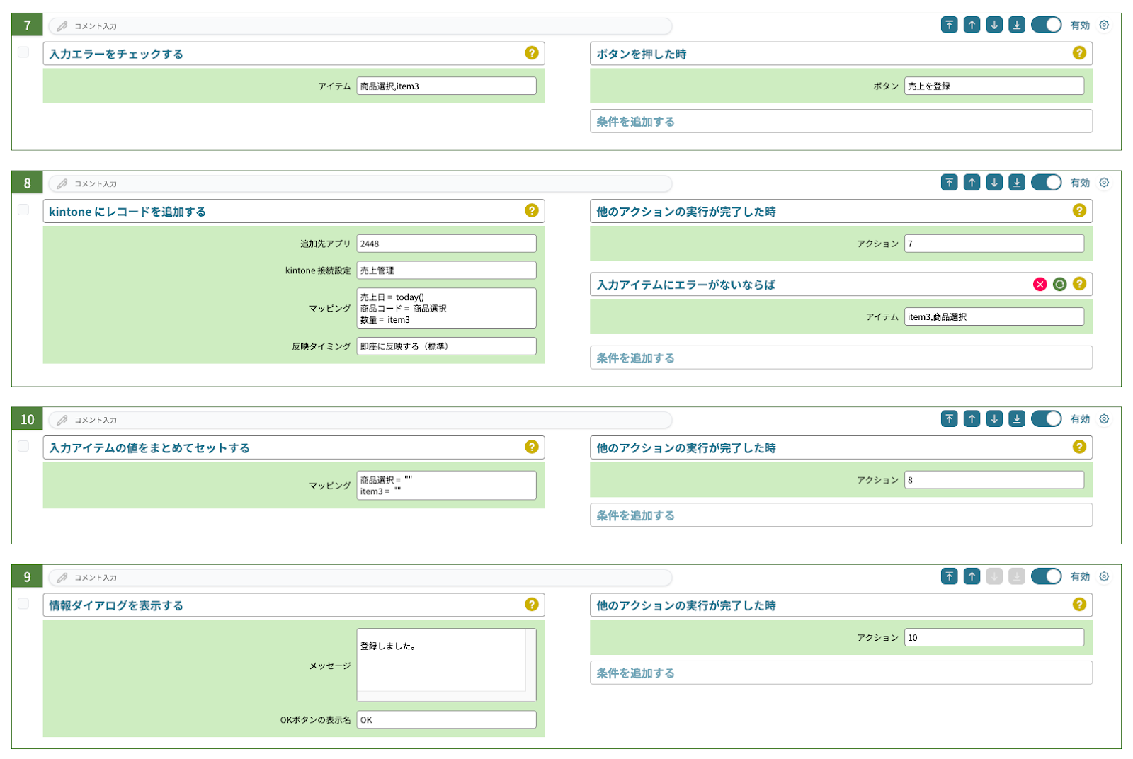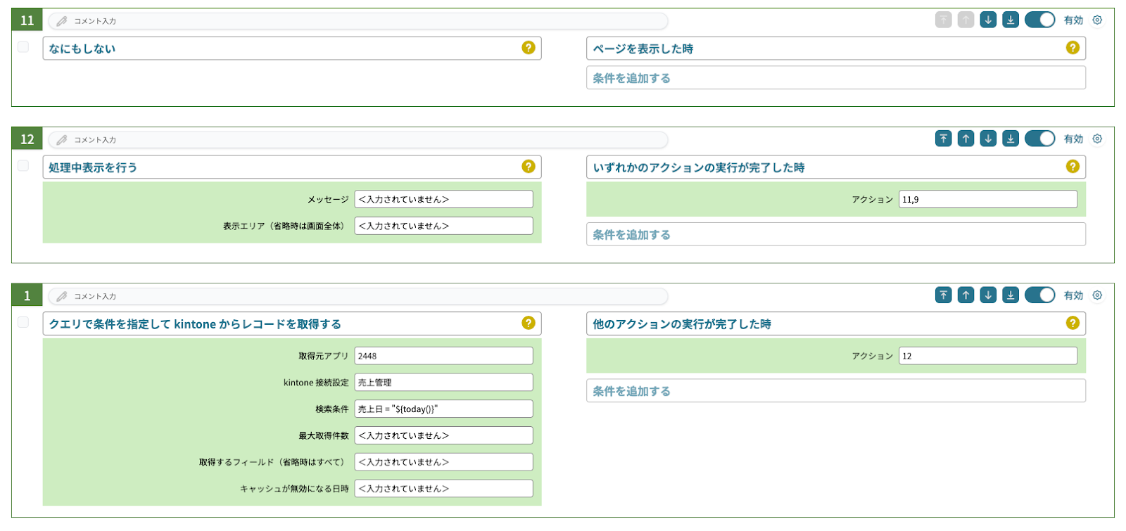 条件「いずれかのアクションの実行が完了した時」を使うと、画面表示時とレコード追加後のどちらかの時に当日の集計表示が可能になります。繰り返し処理はうまく使うとアクションを減らせるので工夫すると良いでしょう。