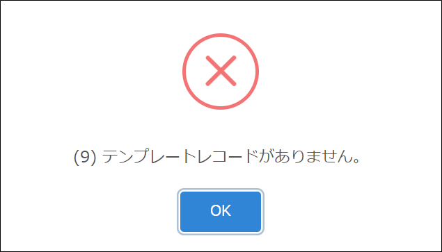 この時に「テンプレートレコード」で選択するレコードは必ず事前に取得しておきます。もし取得できていない場合は、下記のように「テンプレートレコードがありません」というエラーが表示されます。この場合はアクショングラフを表示するなどしてアクションの順序を確認し、やること「PDFを出力する」が実行される前にテンプレートレコードの元となるレコードが正しく取得できているかを確認しましょう。