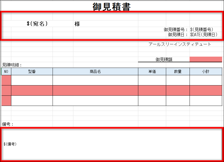 「御見積書テンプレート」Excelファイルを下の画像の要領で作成し、赤い枠で囲まれているセルに対しフィールドコードとgusukuコマンドを入力します。