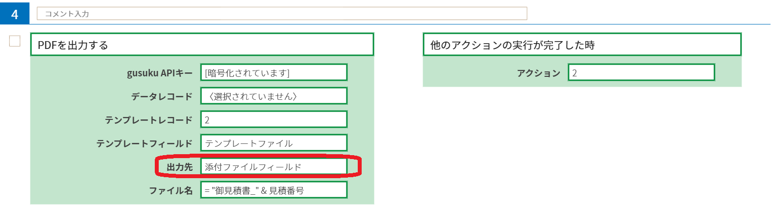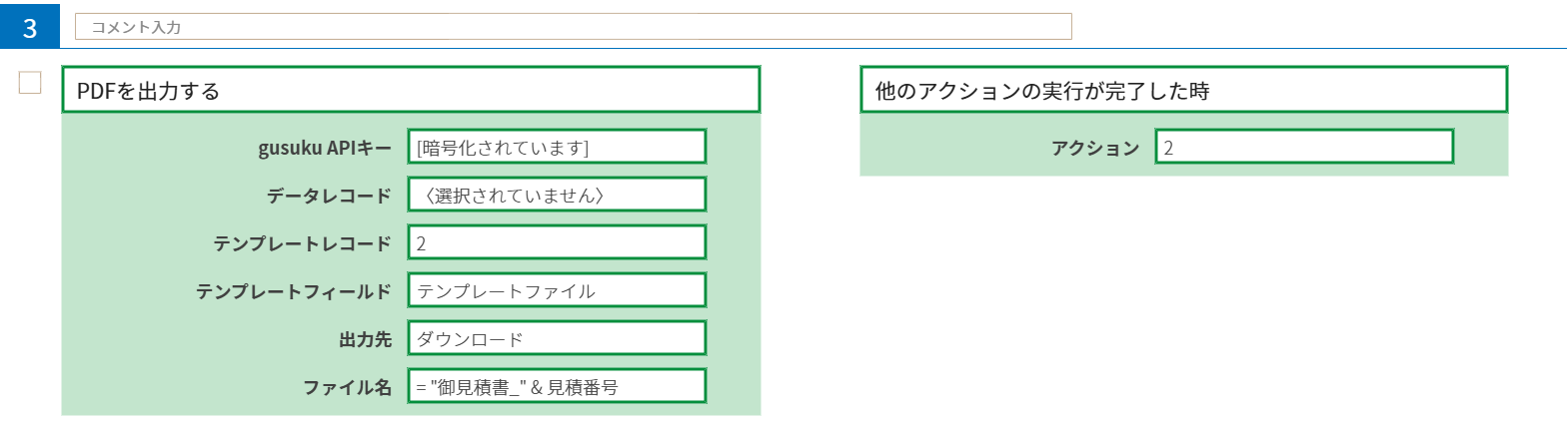 後続のアクションで「PDFを出力する」の結果を用いることで出力したPDFファイルを添付ファイルフィールドにセットすることができます。
