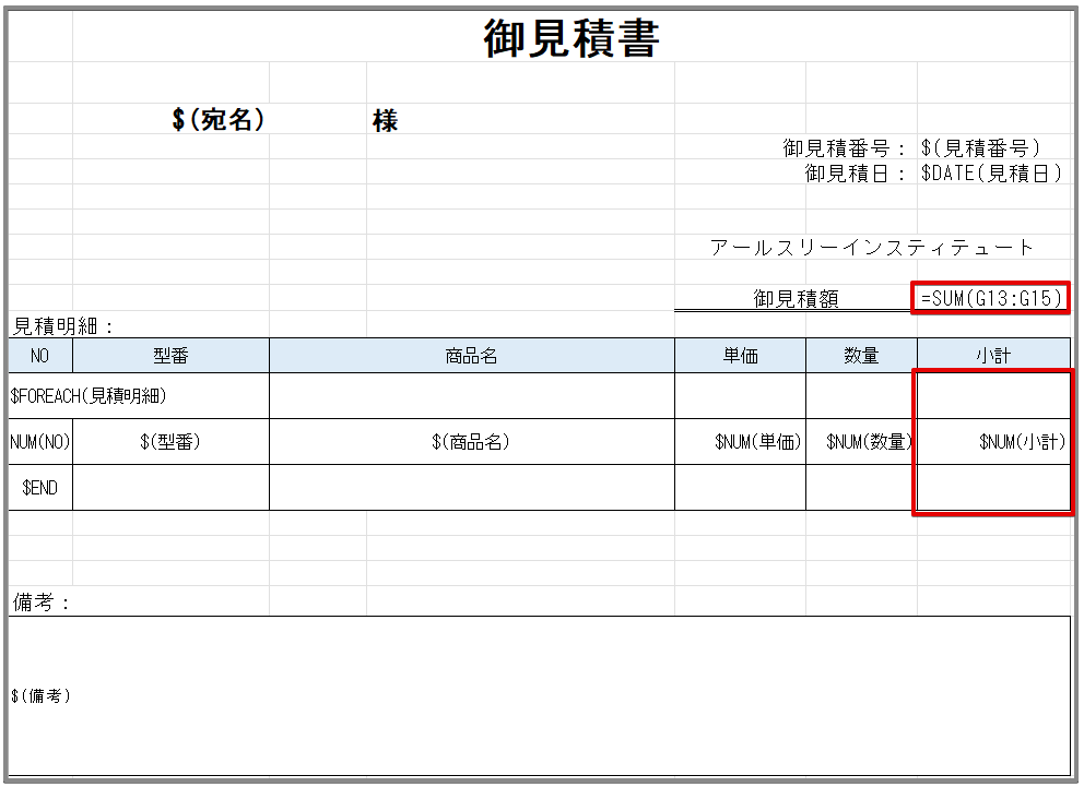 御見積額は小計と同じ「計算」フィールドですので、$NUM(合計金額) の記述でも出力可能ですが、今回はExcelのSUM関数を使用して、出力してみましょう。