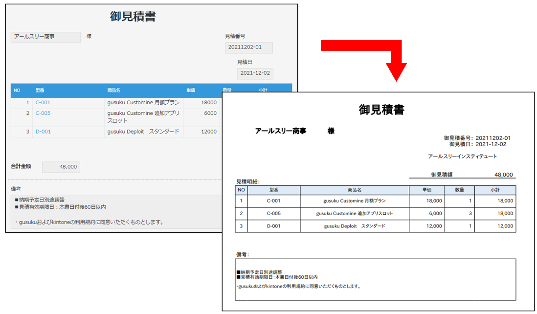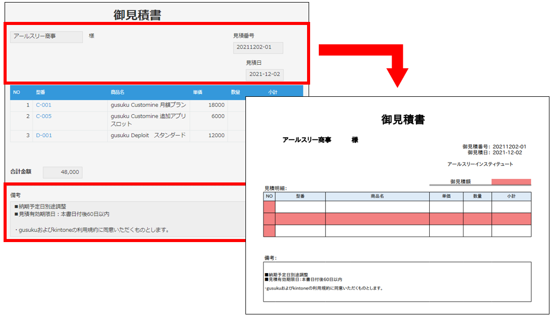 もし、意図した通りに出力されない場合は、「sample_御見積書テンプレート」の設定を確認してみましょう。
