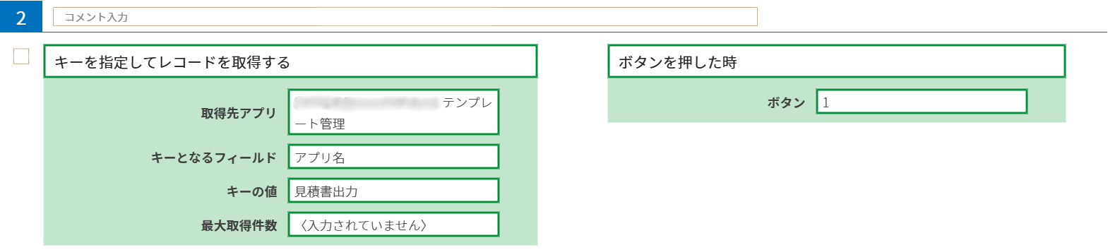 まず、詳細画面表示の際にボタンを設置し、押下した際にやること「キーを指定してレコードを取得する」を使用して、先ほど作成した御見積書テンプレートを登録したレコードを取得しておきます。