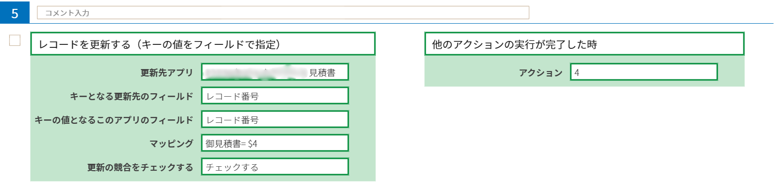 今回はやること「レコードを更新する(キーの値をフィールドで指定)」を使用し、フィールドマッピングで添付ファイルフィールドに「=$4」(= $「PDFを出力する」のアクション番号)と指定して、PDFファイルを添付します。