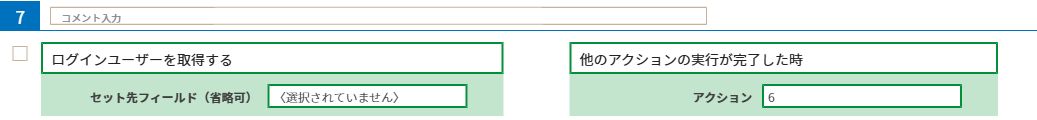 やること「ログインユーザーを取得する」、条件「他のアクションの実行が完了した時」を用います。