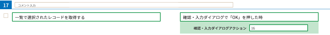 やること「一覧で選択されたレコードを取得する」、条件「確認・入力ダイアログで「OK」を押した時」を用います。