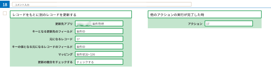 「やること」のパラメータの、キーとなる更新先のフィールドと、キーの値となる元になるレコードのフィールドはそれぞれ「案件ID」を設定します。