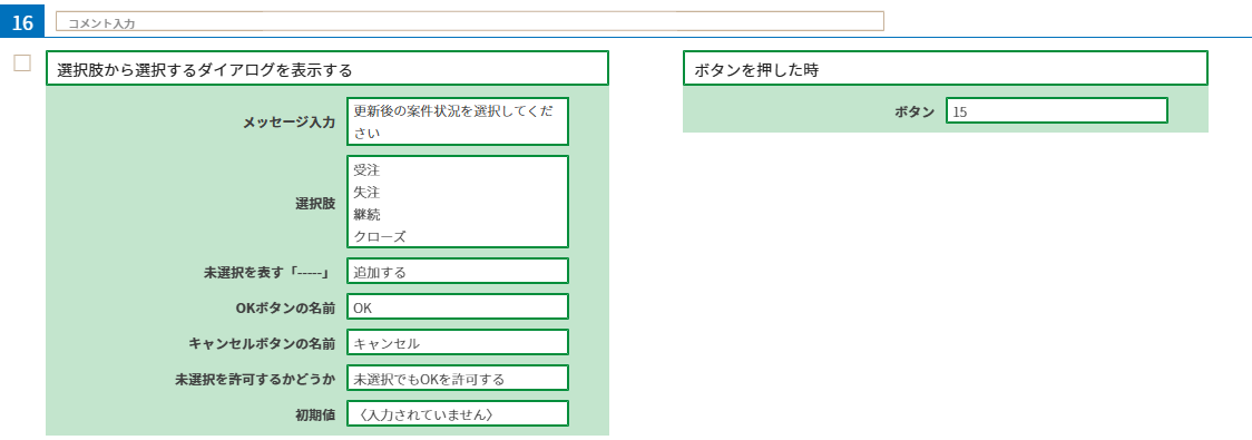 「案件状況」の値は、やること「選択肢から選択するダイアログを表示する」を使って、プルダウン形式で選択しています。