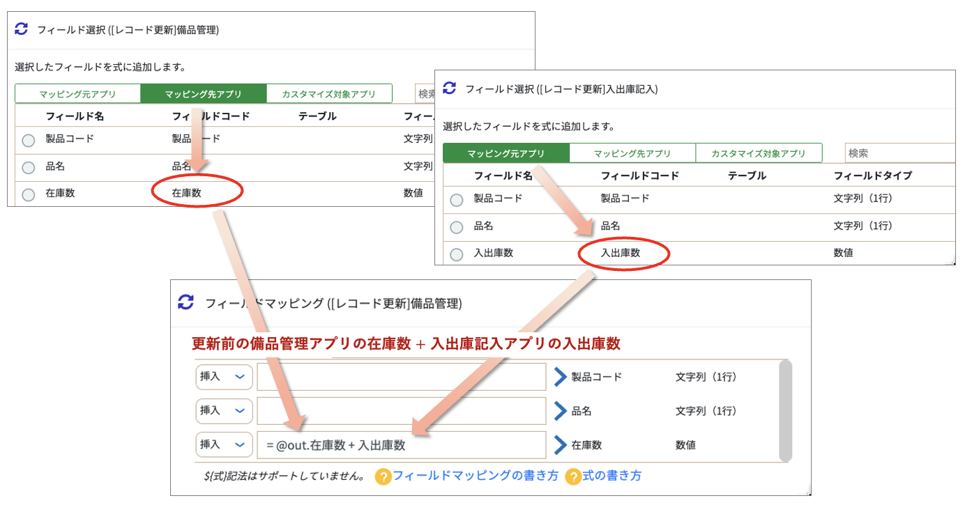 やること「レコードをもとに別のレコードを更新する」が実行されると、「製品コード」のフィールド値が同じレコードを「備品管理アプリ」から1つ取得します。取得したレコードの値はマッピングで使うことができるため「更新後の在庫数 = 更新前の在庫数 + 入出庫数」のように、計算結果をレコードに反映するような処理が実現できます。